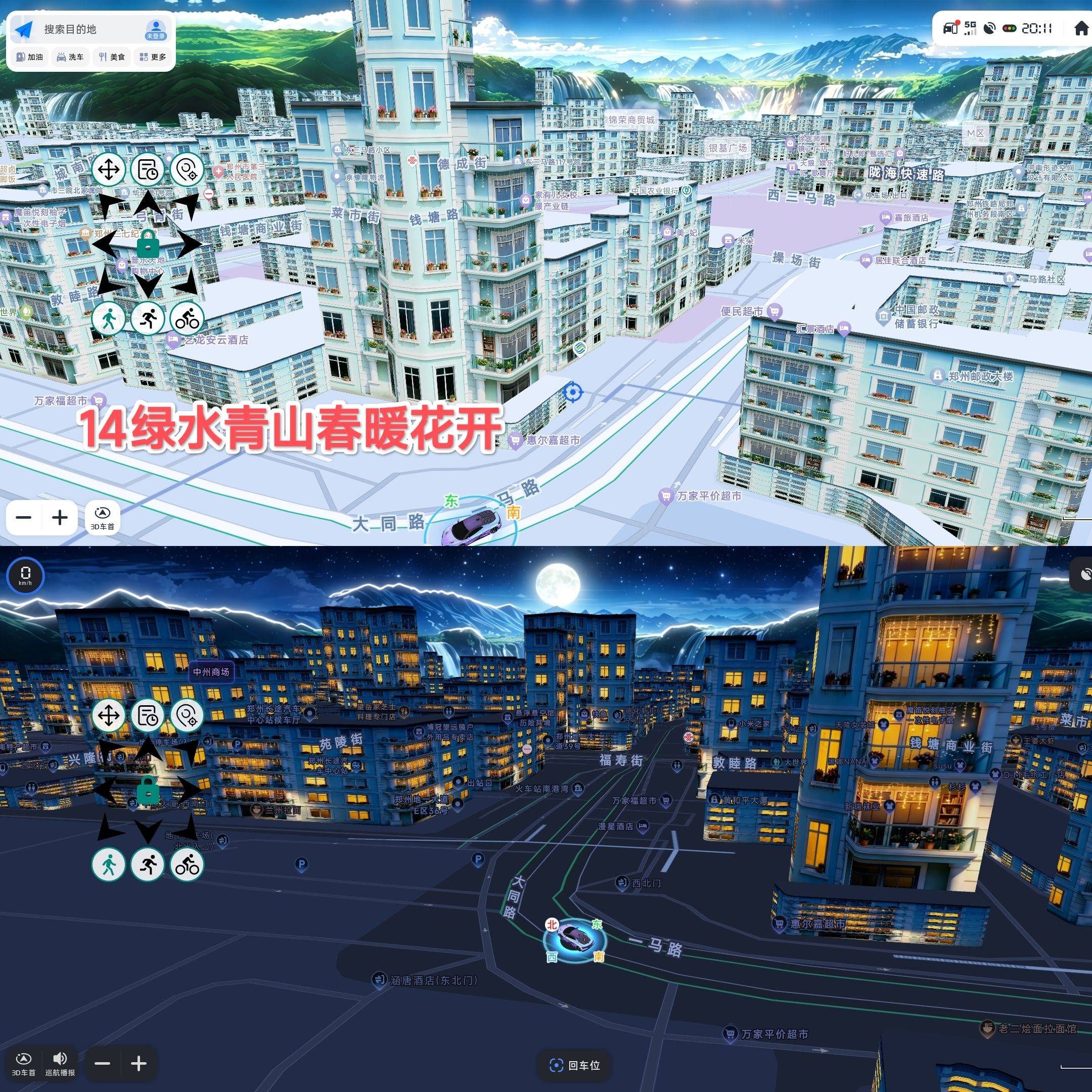 - 夜晚模式:月光铺洒的静谧都市,万家灯火与山间瀑布交相辉映,无喧嚣,只有治愈感。